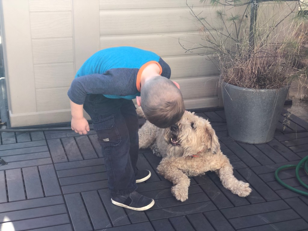 Most of the time, I don’t get scared of the dogs harming T; in fact, it’s often the opposite. I worry that he’ll get over excited and aggravate the dog, like pull his tail.