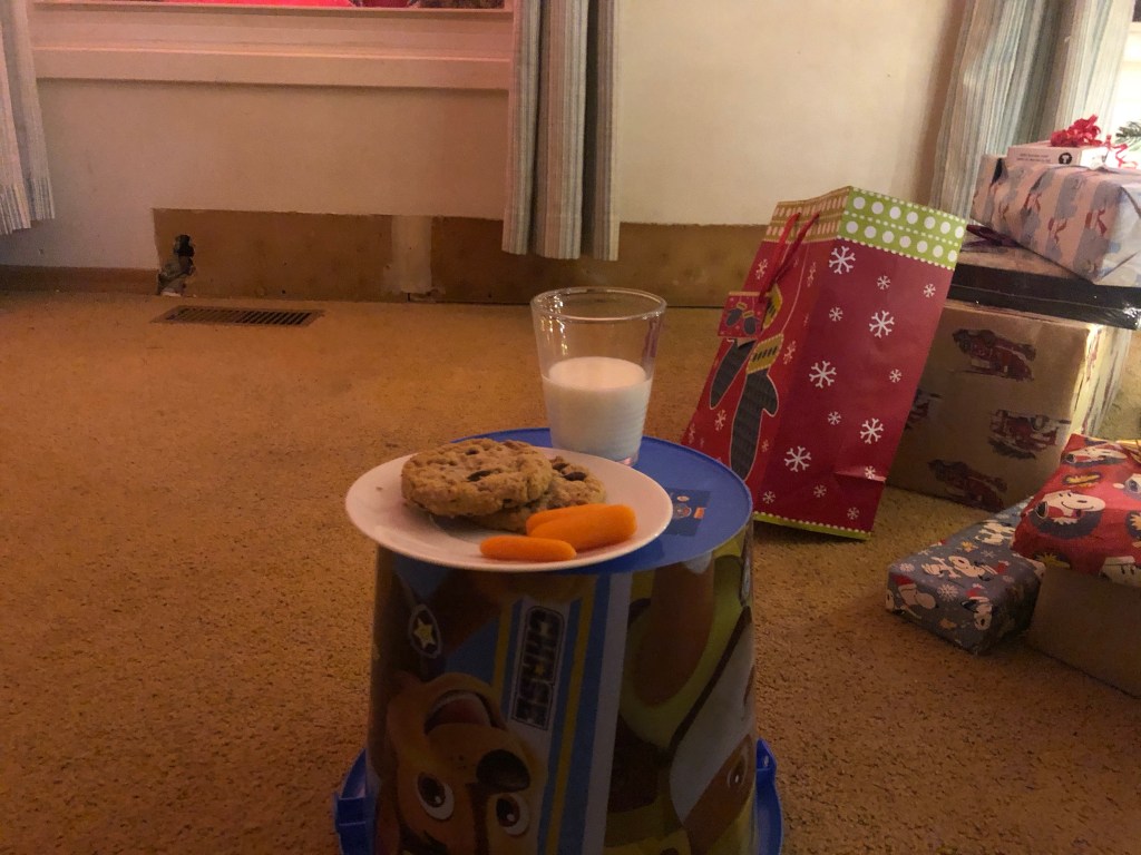 Before bedtime on Christmas Eve, T put out a glass of milk, cookies and carrots for Santa.