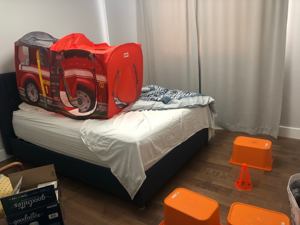 He had set up a pretend campsite and turned his foldable firetruck, gifted from his Grammy and Grandad – into a tent.