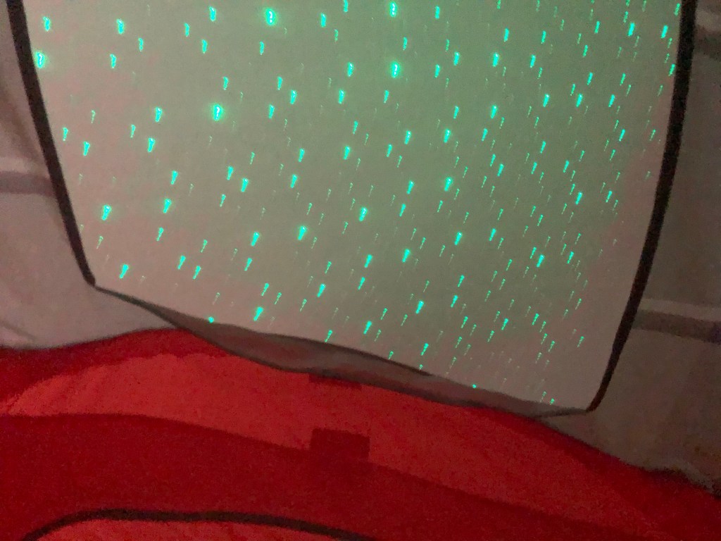 T turned on his Galaxy Cove, which projects a starry pattern and light onto the ceiling and walls. Lying on the bed and looking up at the starry ceiling, it felt like we were really camping.