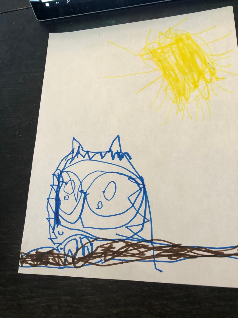 I tried to build his confidence by sharing his work with his class like it was the second coming of Picasso. But T was not having any of it when I asked him to share his wonky looking owl above.