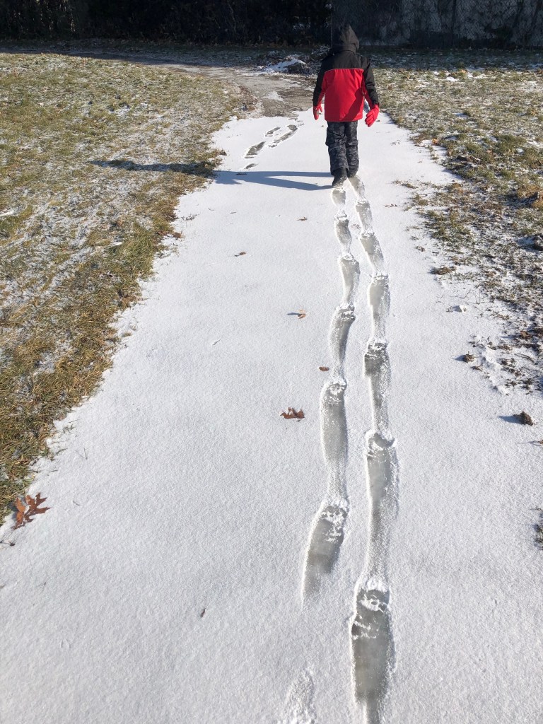 There was a nice long stretch of ice on the path home that T enjoyed before we returned to class.