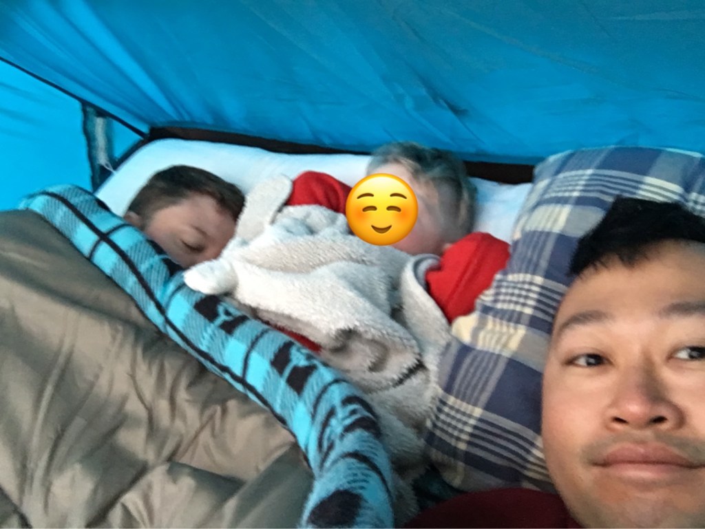 Snuggling together in a tent is a priceless experience – especially when you wake up next to this sleeping pose at 7 am.