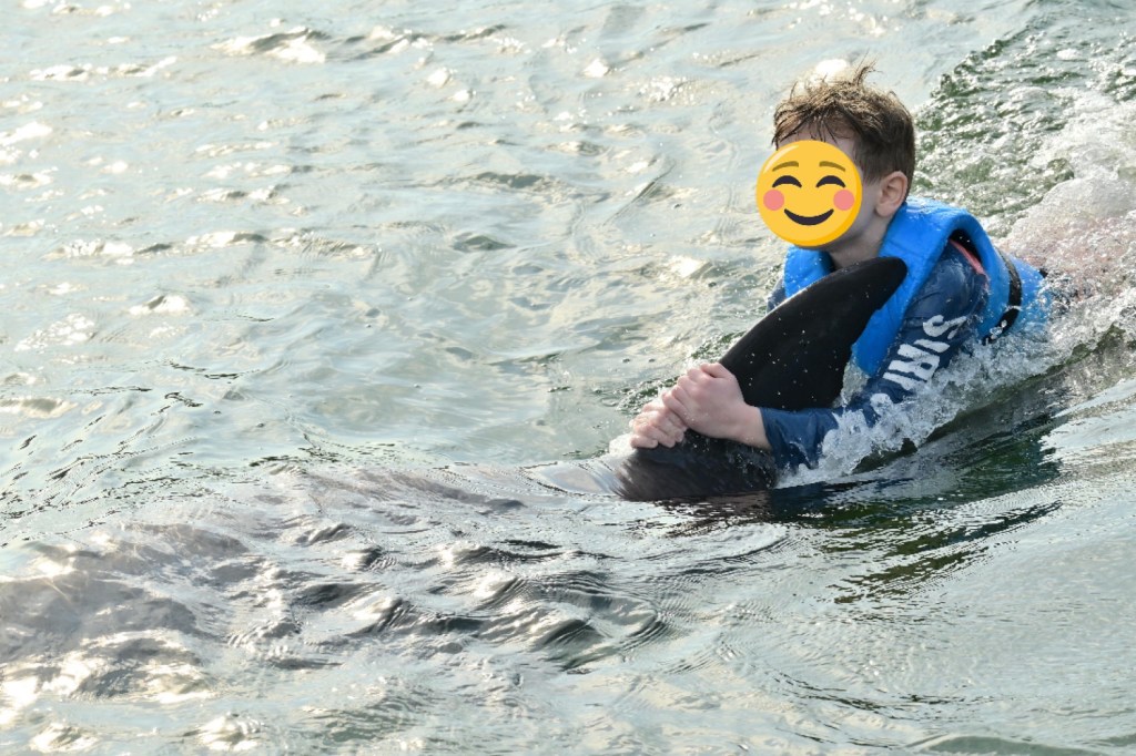 T got to do an extra activity, the dorsal swim (below), and went for a short ride by hanging onto the dolphin’s fin.