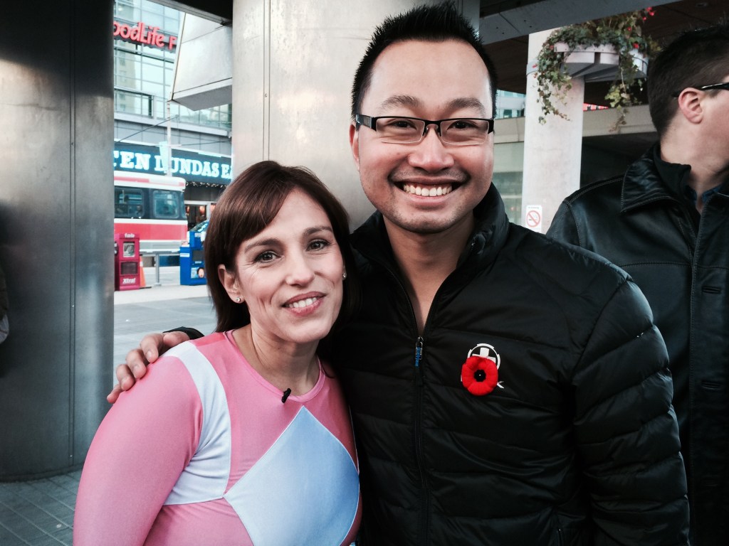 Meeting Amy Jo Johnson, the original Pink Power Ranger, in 2014. She also lives in Toronto and after losing a bet with a costar, she showed up in costume at Dundas Square to play her guitar.
