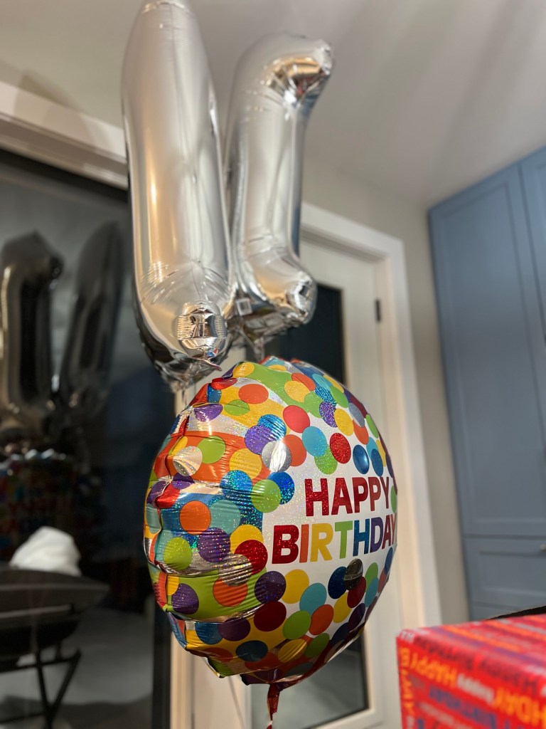 He woke up to balloons taped along the stairway, outside his room, leading up to our foyer closet – with a happy birthday banner and our traditional large shiny number balloons – an 11 this year.