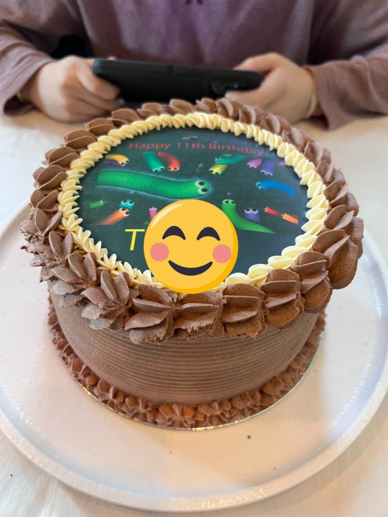 Later that weekend, we had lunch with family and enjoyed his “real” cake; a Slither-themed chocolate cake with buttercream icing.