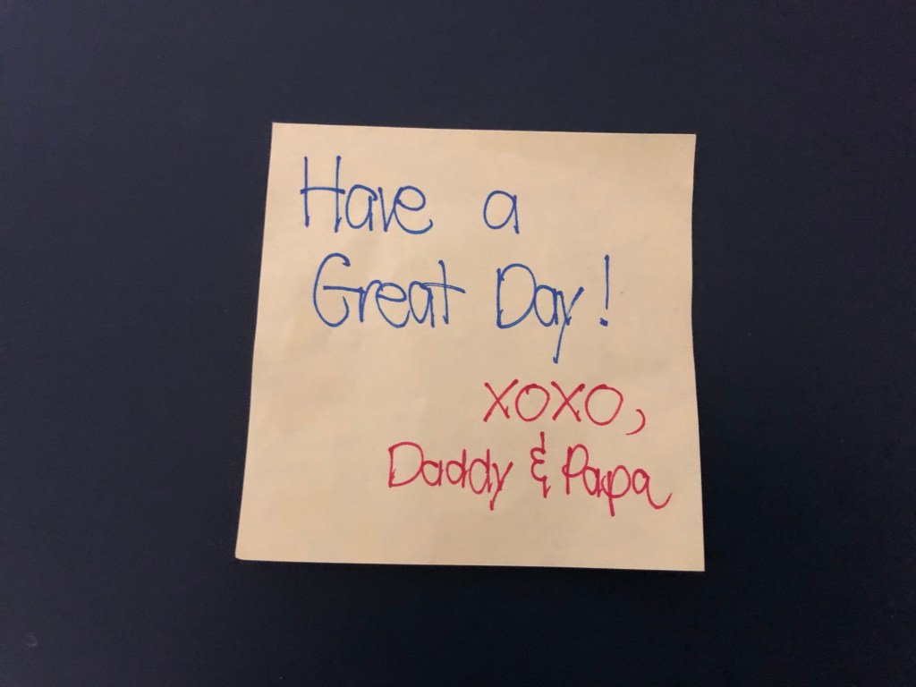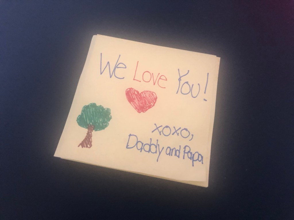 He came up with and wrote the message and I helped him spell it: “I love you. Xoxo, T, Daddy, Papa.”
