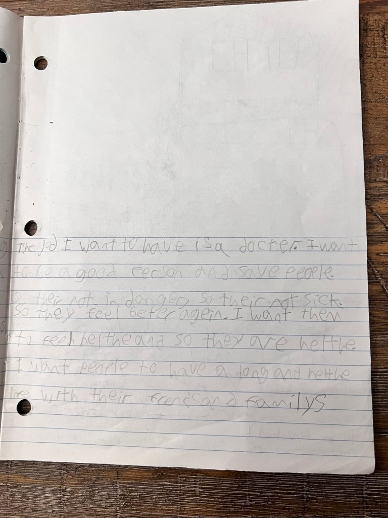 “The job I want to have is a doctor. I want to be a good person and save people. So they’re not in danger. So they’re not sick. So they feel better again. I want them to feel healthy and so they are healthy. I want people to have a long and healthy life with their friends and family.”