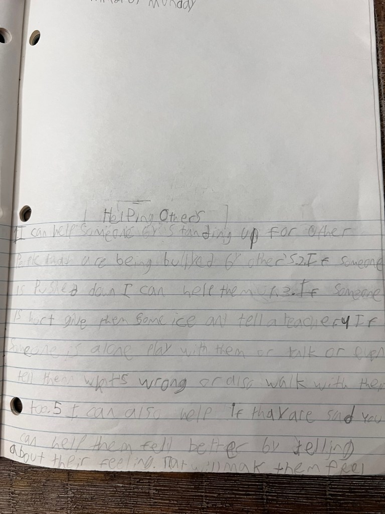 “I can help someone by standing up for other people that are being bullied by others. If someone is pushed down, I can help them up. If someone is hurt, give them some ice and tell a teacher. If someone is alone, play with them or talk or even tell what’s wrong or also walk with them too. I can also help if they are sad. You can help them feel better by telling about their feelings that will make them feel better.” 🥹