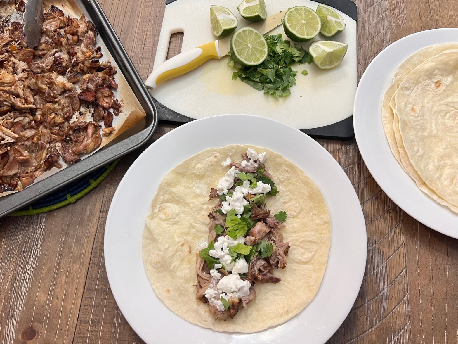 I couldn’t find pickled red onions in the store so I topped our tacos with leftover feta in our fridge.