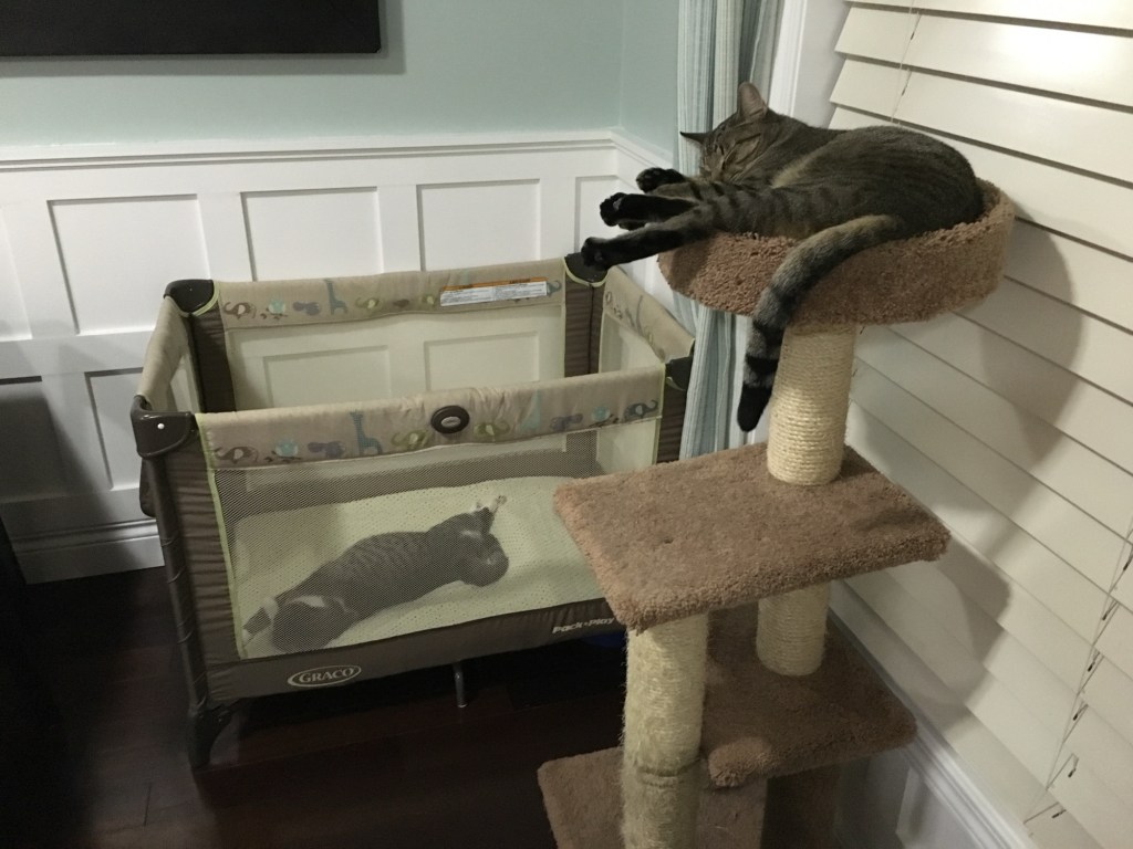 Yes, those two boxes are our previous cats. 😂What’s this green alien object?This picture still kills me with cuteness. 🥰The dynamics in our home changed when T arrived, unexpectedly, 10 months later. I still chuckle at this photo of Lanaya in T’s crib.